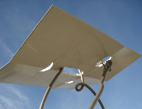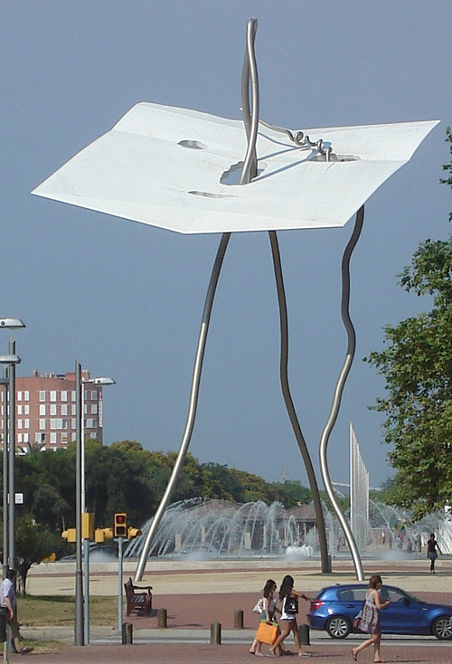 Llena’s floating, kite-like mask, effortlessly supported on three delicate, twisting tendrils, initially caused strong reaction, but is now a comfortable favourite. Its apparently ephemeral construction combined with that deceptively simple paper cut-out, refreshing yet impossible in its huge scale, invites you to raise your face skywards, forget your earthbound problems. Location is key here. The artist aimed to produce “a work that one could view in isolation, without interference from nearby skyscrapers”(1) yet it emphasises and includes not just the open space but the surrounding architecture of Hotel Arts, Torre Mapfre and the modern brick apartment blocks.