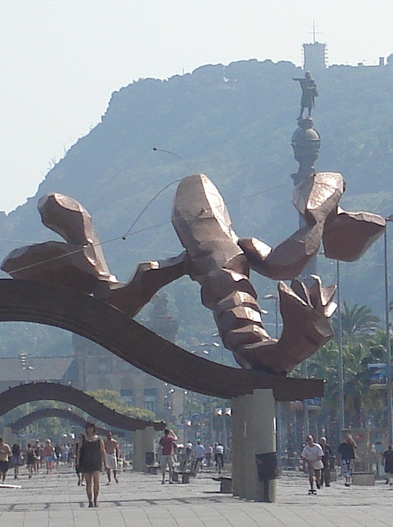 Of such species, I would argue that Barcelona’s denizen is one of the least offensive you’ll find—positively charming, in fact. The city’s giant prawn (la Gamba: though technically it doesn’t count as a prawn – unless you’re in Dublin Bay, when it does – but an escamarlà or langoustine, which itself is not to be confused with the Spanish langostino, as that is an entirely separate controversy) is affectionately known as “Gambrinus” after the restaurant it was designed to crown. It is by the Catalan designer and artist, Xavier Mariscal, and has a whimsically comical air that makes it the perfect seafront companion to Lichtenstein’s cartoonish Barcelona’s Head alongside.